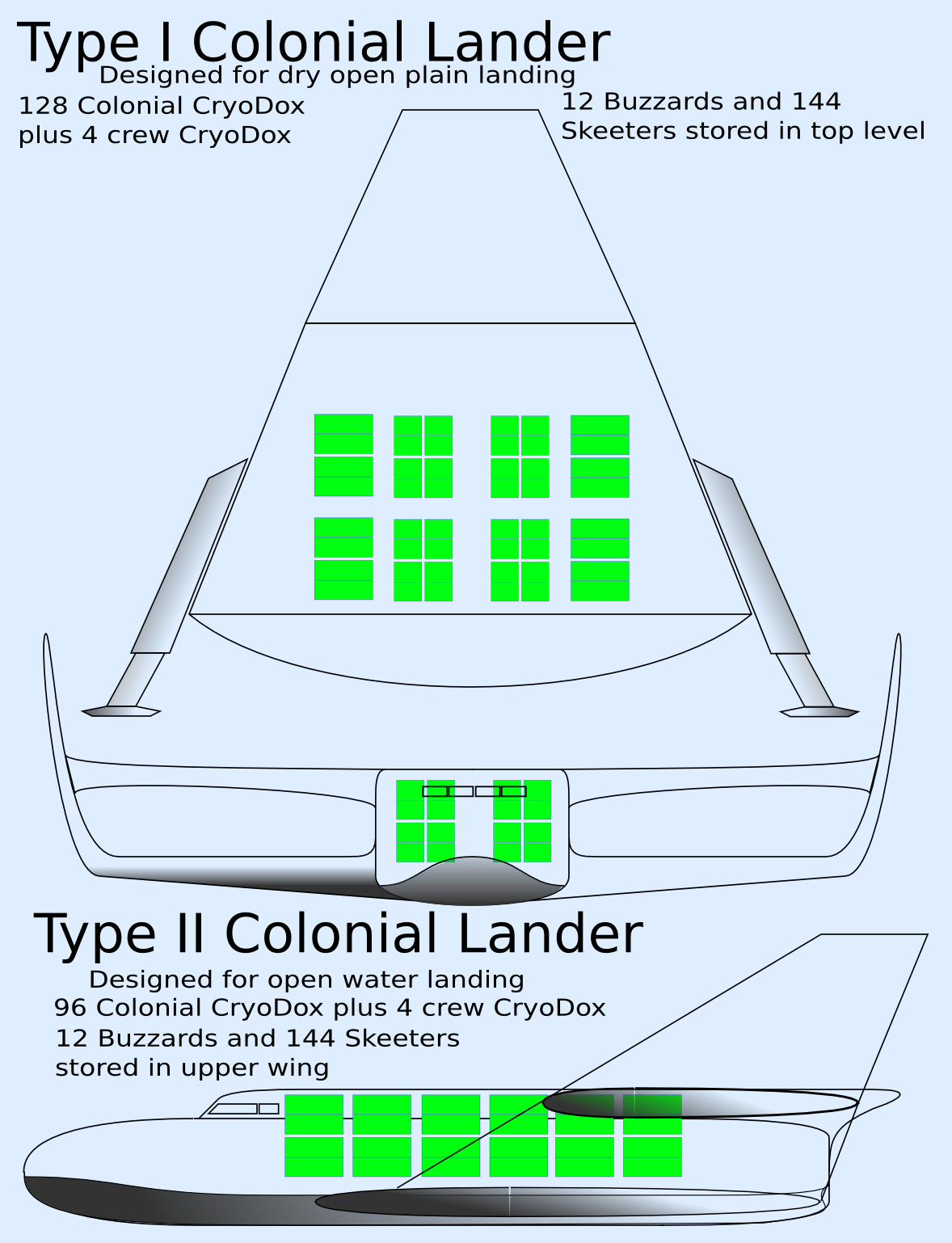Since the planet Micasa is very similar to Earth, two types of colonial landers are used. The Type One is designed for a parachute-assisted vertical landing on dry land. It holds one hundred and twenty eight CryDox to be decanted after landing and four crew chambers that are decanted after warp, but prior to landing.