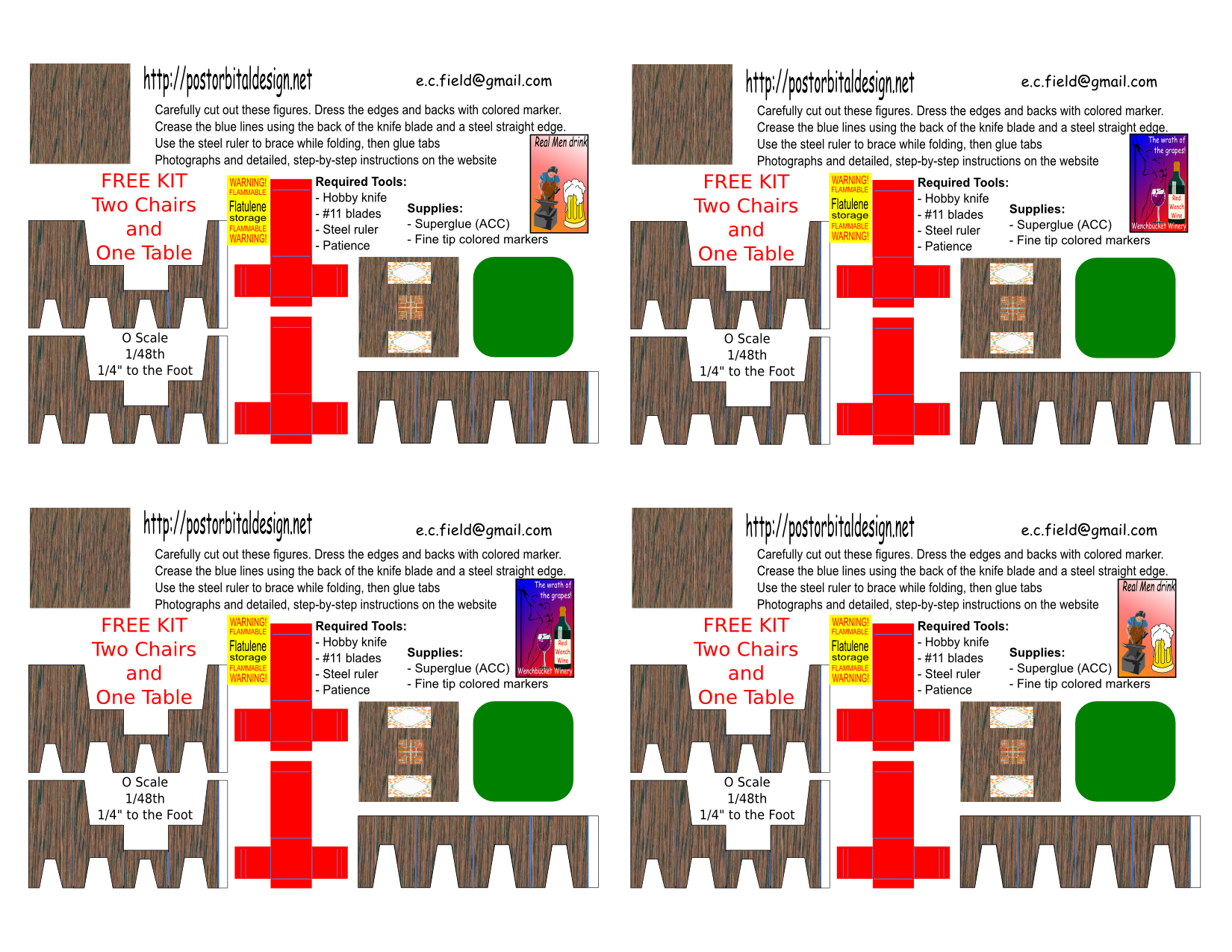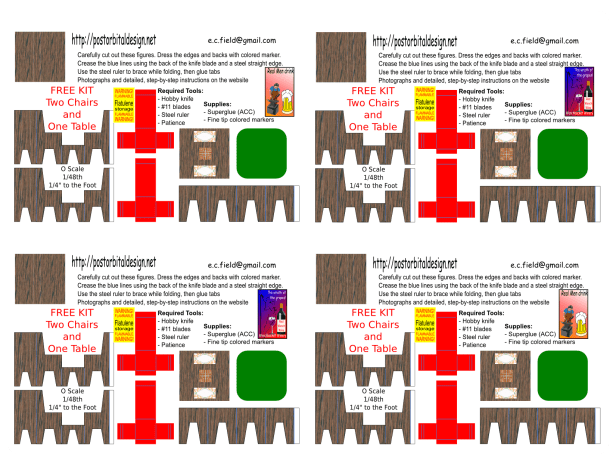 This image will produce four postcards on a single 8.5″x11″ sheet of cardstock. Each postcard contains a kit for one table and two chairs in “O” (1:48) scale.